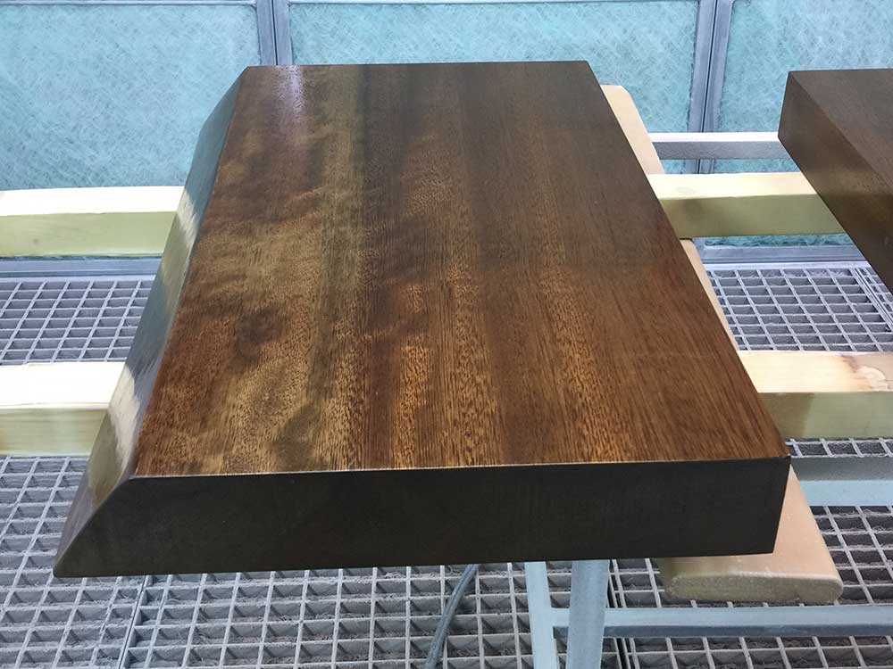 Βαφή λούστρο με ακρυλικό βερνίκι διάφανο ματ σε μασίφ επιφάνειες καρυδιάς, ιρόκο και ακακίας και βαφή λούστρο με ακρυλικό βερνίκι ματ χρώμα επιλογής πελάτη σε μασίφ επιφάνεια δρυός ρουστίκ.
